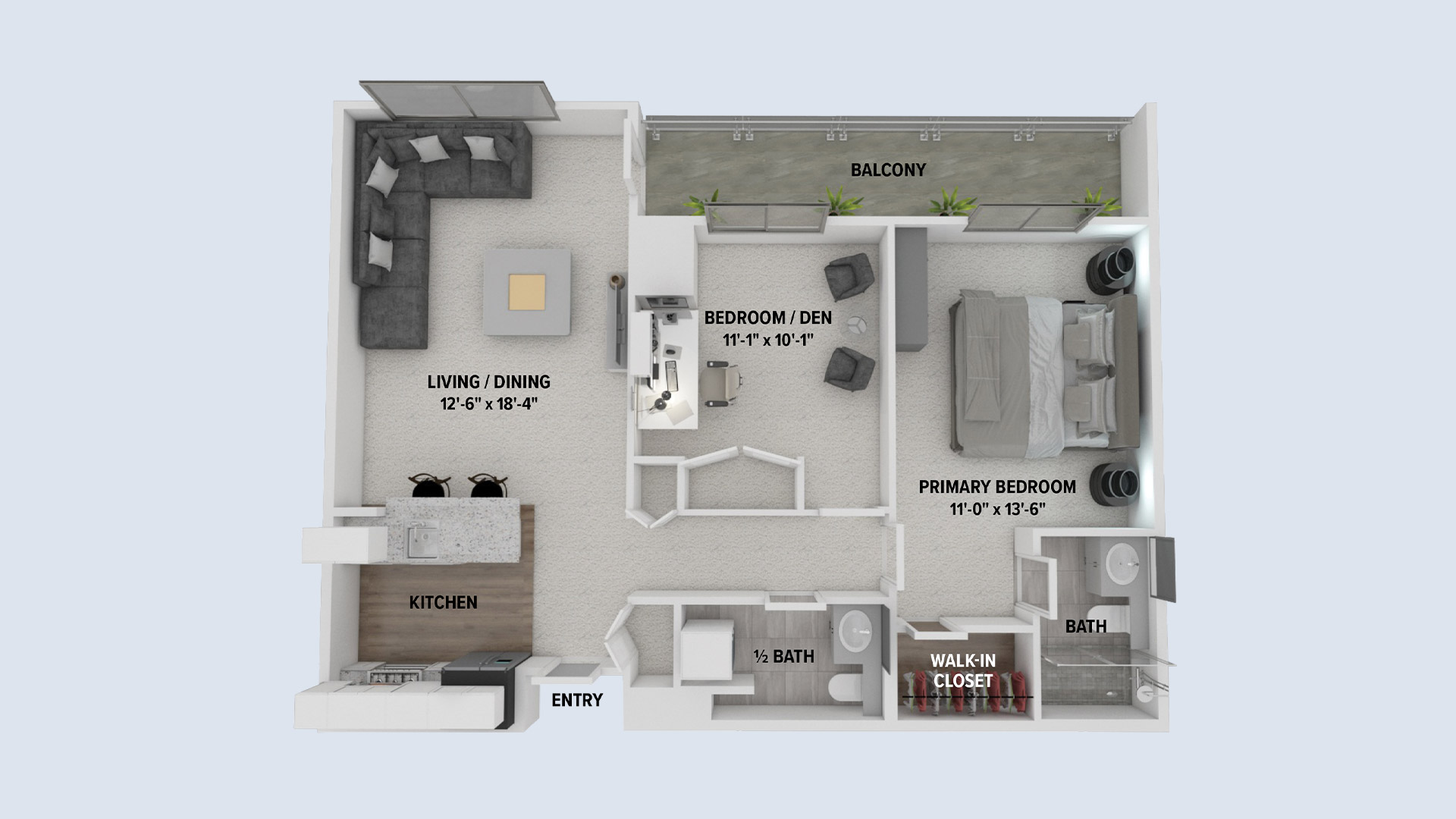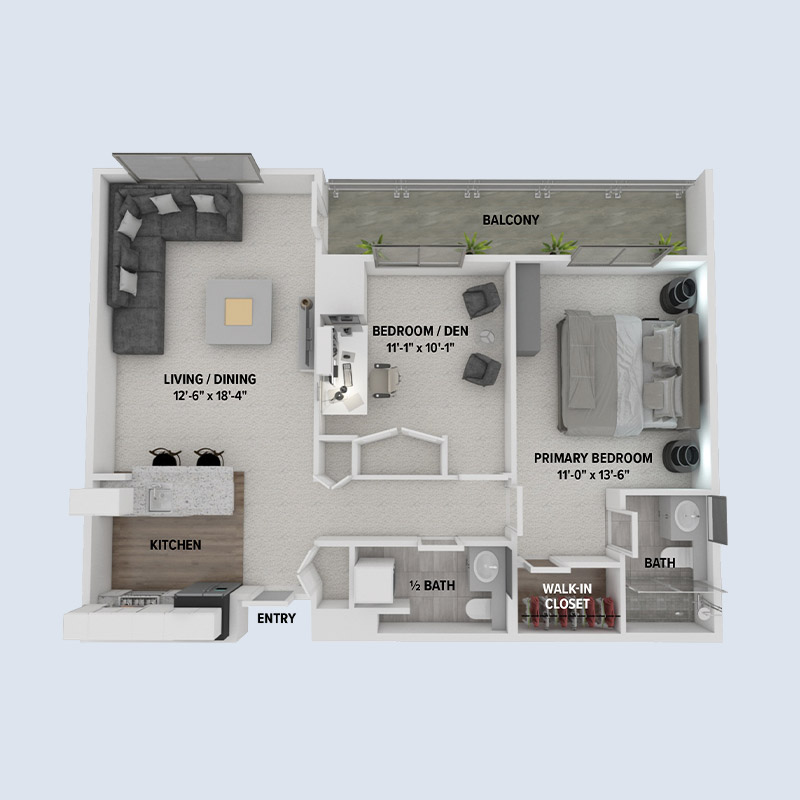 With a walk-in closet in the primary, hall closet and bedroom/den closet, The Plaza gives you ample space to store your things! The apartment home’s living space gives you the option of a living/dining configuration. The Plaza is one of our most popular floor plan options.
